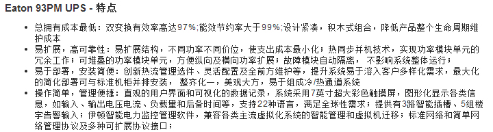 伊頓93PM系統提供了完整的機房整體基礎電力系統。系統包括了一個關鍵的核心機房的中所有供電的基礎設施:輸入/輸出饋線單元、輸入配電單元、可擴展功率模塊單元、維修隔離單元、儲能單元、監控單元、輸出配電單元,如果需要,也可與伊頓的IT專用機柜、可編程型智能PDU組成完整的機房基礎架構,更可與伊頓的AMS/HRS熱流管理系統配套,通過市場領先的運營效率和世界級的智能化管理確保以最低的總擁有成本實現關鍵體系的持續運行。